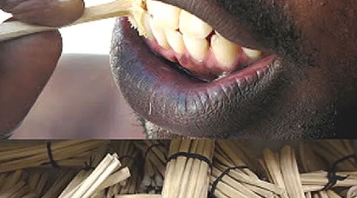 Chew fluoride-containing 'chewing stick' until the tufts become flexible and soft enough to have a soothing effect on the oral tissues, but don't stop at that, hold the end of the stick and allow the tufts to lie perpendicular to the surface of the tooth and brush EACH TOOTH adequately